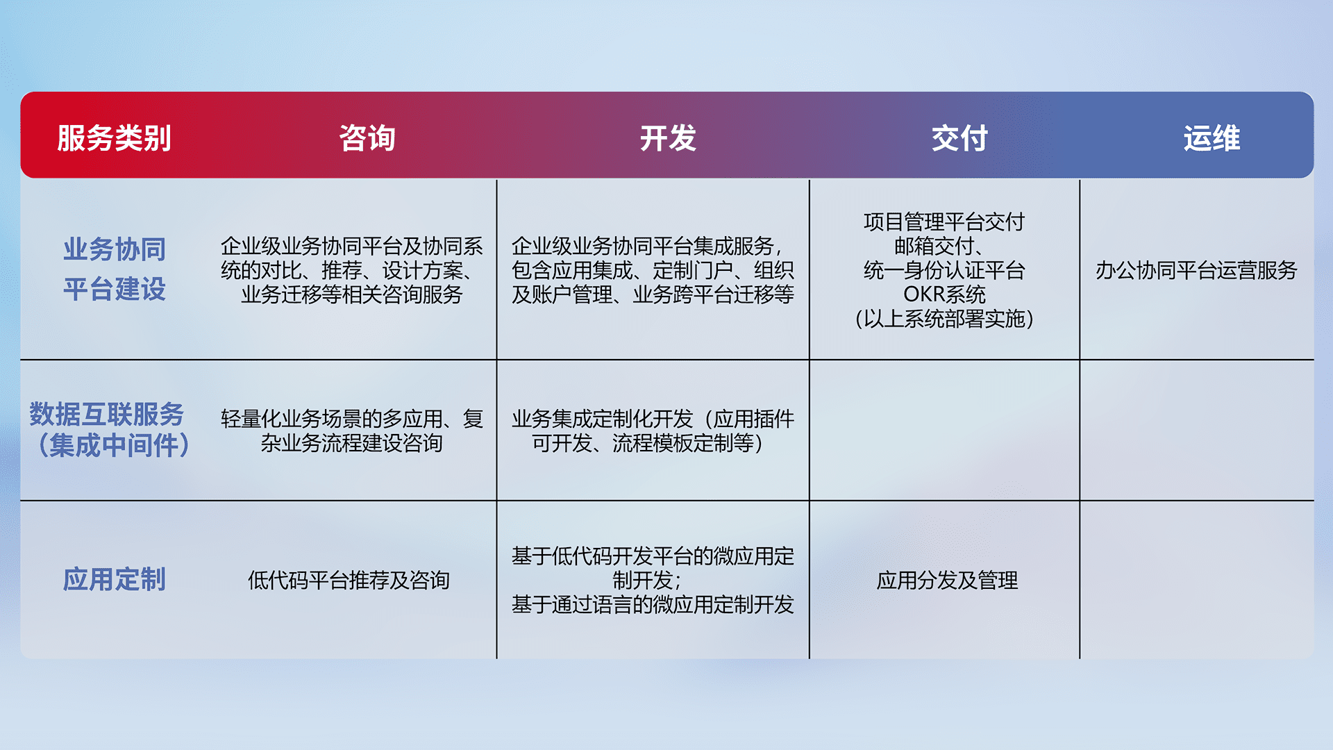 针对钉钉、、企微、、IDaas等平台级产品提供产品的规划、、、、方案、、、、交付、、、、定制化开发等服务,,,实现如统一协同办公、、、、智能客户服务、、、、混合会议管理、、智能数据查询、、等业务场景,,,实现数字化转型。。