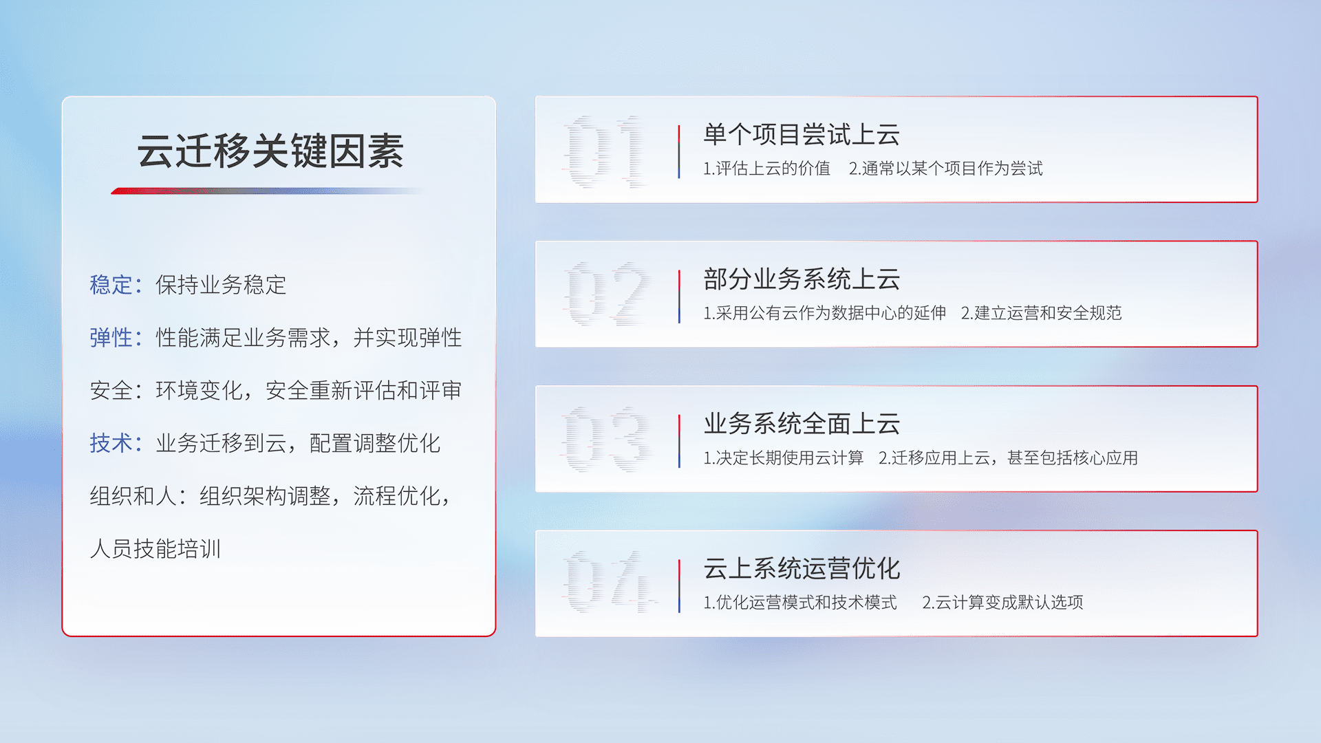结合实际业务,,从规划设计、、云平台选型、、、、云原生改造、、、数据迁移、、、集成交付,,,,迁移全过程为客户识别最佳上云路径,,做好风险识别管理,,,设计网络架构、、身份权限、、、安全审计合规、、、操作审计、、日志审计、、监控告警策略、、、多站点容灾设计等,,对云上基础设施进行整体规划,,,,提升IT治理水平,,,,以满足弹性、、、高可用、、、高性能的需求。。。