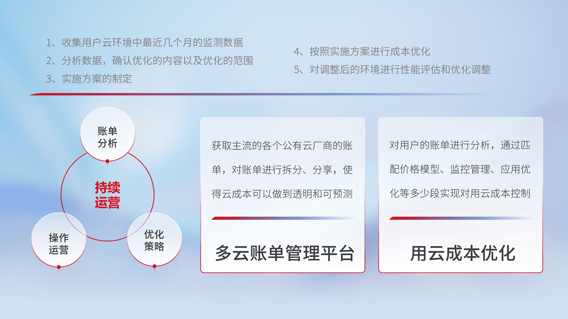 通过多云纳管,,,,以统一的资源数据模型把客户的云资源进行抽象和封装,,进而实现对多云资源的统一操作,,保障云资源管理的可靠性、、、、稳定性与可用性。。量身定制化运维内容,,,,配置、、开发运维、、补丁管理、、备份、、、监控、、、认证和访问管理、、、、审计和日常巡检等,,保障在用云过程中的可靠度,,,稳定度以及高可用率。。。。